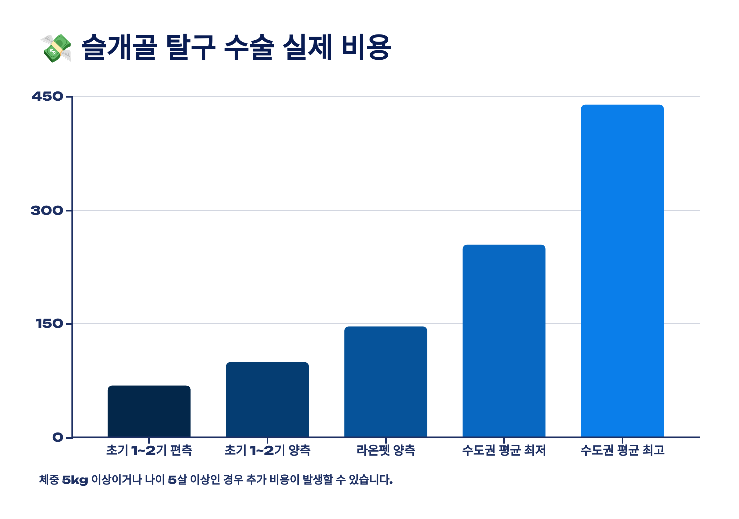 슬개골 탈구 수술은 수술 부위, 병원 등급, 지역에 따라 최소 60만 원에서 최대 200만 원까지 차이가 날 수 있어요. 보통은 한쪽 다리 기준 평균 100만 원 내외가 많이 발생하는 편이에요. 🦴💳