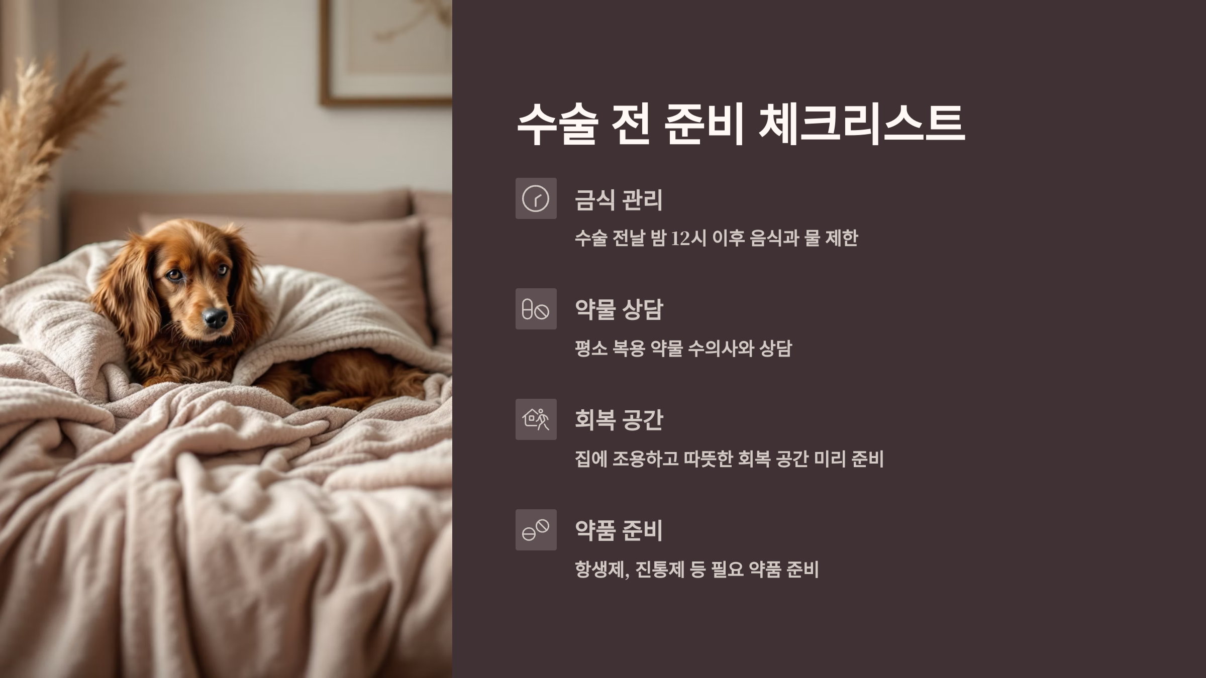 또한 수술 전에는 12시간 이상 금식이 필요하므로 저녁 식사 후엔 간식이나 물도 제한해야 해요. 그리고 수술 당일 목욕은 금지이며, 산책이나 흥분되는 활동도 피하는 게 좋아요. 🛑